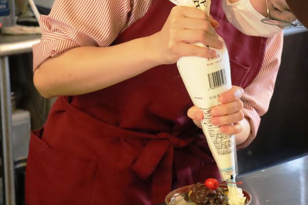 ヒュッテ荏田南では、キッチンスタッフ手作りのフルーツみつ豆を提供しました。寒天や梨のコンポートも手作り、あんこも小豆をコトコト煮て手作りしました。最後にクリームをのせ、仕上げに黒蜜をかけて出来上がり。モモも「ぼくにもくれるの?」という表情をしていました。ご入居者からは「とてもおいしいわ!」「お店に来たみたい!」と感想をいただきました。
