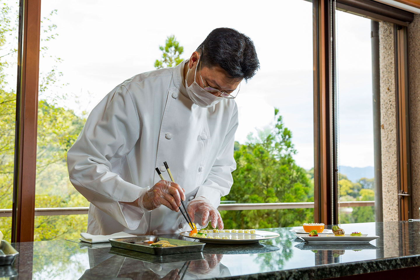 和洋の料理人たちが、味わいはもちろん、目や香りでも楽しめる料理をご提供。季節ごとに表情を変える日本庭園、館内を彩る四季折々の生花が、自然の美しさと尊さを感じさせ、癒やしの時間を届けてくれます。