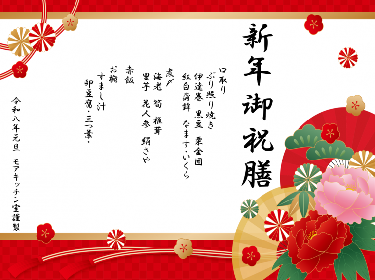 元日の昼食に『新年御祝膳』を提供させていただきました。縁起の良い食材が彩りよく盛りつけられており、皆様からも「お正月ですね」「作るのは大変だけど、作ってもらって食べられるのは贅沢ね」など会話も楽しまれながら、美味しい新年のお祝いとなりました。