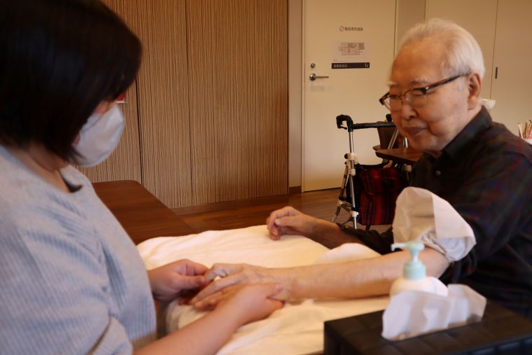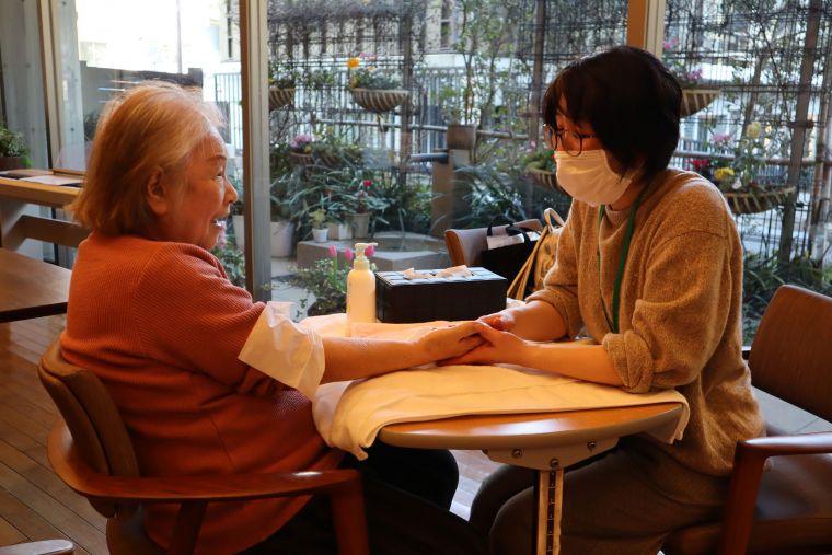 今月も日本ハンドケア協会の方にお越しいただき、ご入居者の皆様にハンドケアを体験していただきました。楽しくお話をされながら施術を受けたり、気持ちよくてウトウトされる方など、思い思いにリラックスされておりました。