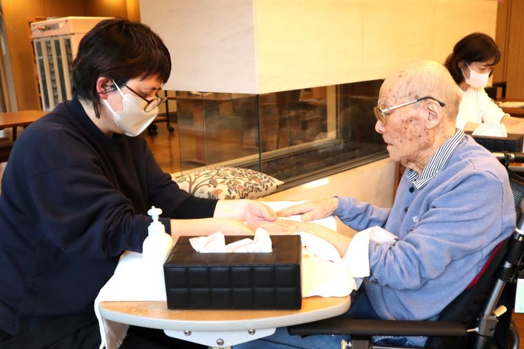 毎月第1月曜日に開催しておりますハンドケアマッサージ3月も開催、たくさんのご入居者に癒しの時間を過ごしていただいております。今回は、他事業所にてアクティビティを担当しているスタッフが体験のために来館し、雰囲気や技術を学んでいただきました。体験を学びとして持ち帰り、ご入居者の皆さまへのサービスにつなげてまいります。