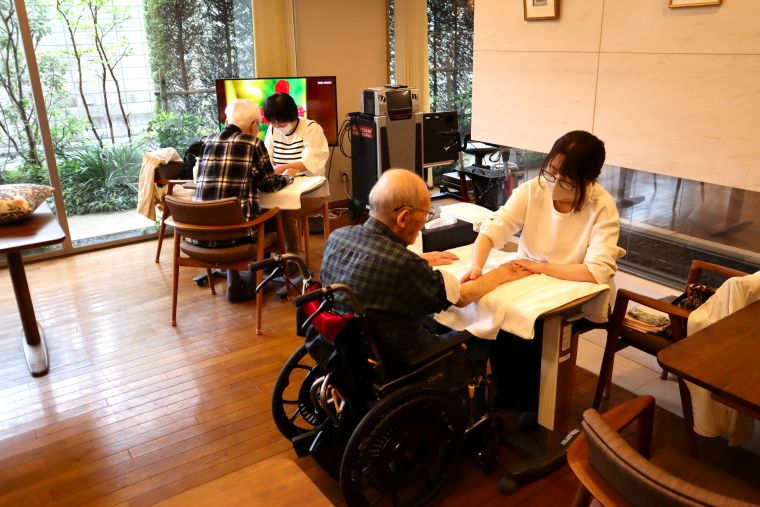 今月もハンドケアマッサージを開催しております。この日は、お天気にも恵まれて温かな日差しが差し込む中、施術を受けながらお花見の思い出などを懐かしく話されておりました。