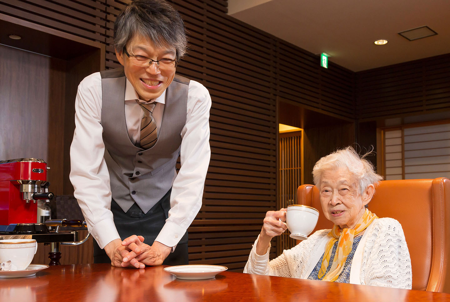 専門性の高い多職種のスタッフが常駐しています。看護師は24時間常駐。介護スタッフは資格保有率100%のプロフェッショナルです。ご入居者2名に対し、1名のスタッフで、手厚いケアを行います。