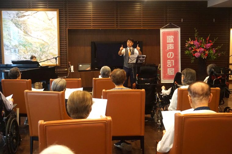 ヒルデモア世田谷岡本では敬老の日のお祝いイベントを二日間開催しました。一日目は「洋服販売」、「歌声の部屋(コンサート)」です。ご入居者皆様にお集まりいただいたコンサートの前には、賀寿のお祝いのお花をプレゼントさせていただきました。「歌声の部屋」は今年二回目の開催です。前回もご入居者の皆様に大好評、歌い手の方の熱烈なファンもいらっしゃいます。大盛り上がりの一時間はあっという間に過ぎていき「次はいつかしら?」のお声もいただいています。
