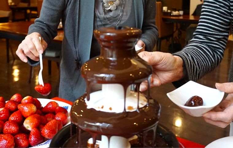 2月14日のバレンタインデー、ヒルデモア世田谷岡本ではランチのデザートに「チョコレートフォンデュ」をご用意しました。「私達の若い時にはバレンタインなんてなかったわよ。でも楽しいイベントは好きよ。」と献立表を見ながらお話されるご入居者の皆様。当日チョコレートを囲む皆様とても楽しそうでした。いちごとチョコレートの組み合わせが大人気でした。