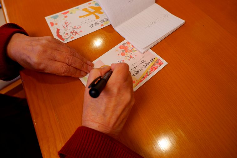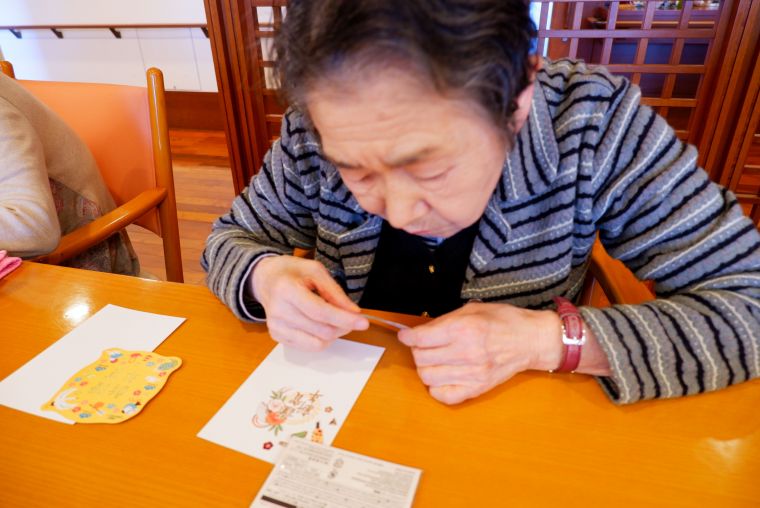 クリスマス会が終わり、皆さまの気持ちも少しずつ新年の準備へと向かう中、年賀状づくりを行いました。複数のデザインからお好みのものを選んでいただいたほか、真っ白なはがきにシールやスタンプをあしらい、思い思いのオリジナル年賀はがき作りを楽しんでおられました。「この漢字、どう書くんだったかしら? ど忘れしちゃって…」とスタッフに尋ねるお姿もあり、和気あいあいとした雰囲気の中、とてもあたたかな時間となりました。