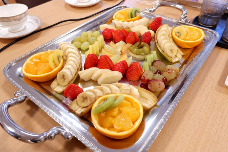 バレンタインイベントとしてチョコレートフォンデュをお楽しみいただきました。2種類の苺、バナナ、ラ・フランス、ぶどう、文旦、オレンジ、キウイなど色とりどりのフルーツが並び、「うわ~どれからいこうかな」「見てるだけでおなかいっぱいね」と思わず笑顔がこぼれます。そのほかバームクーヘンやワッフル、ポテトチップスなどの変わりダネもご用意。バームクーヘンは特に人気で、あっという間に無くなっていました。甘く温かいチョコレートソースに皆様手がとまらず、「もう食べられないわ」と大満足のご様子でした。