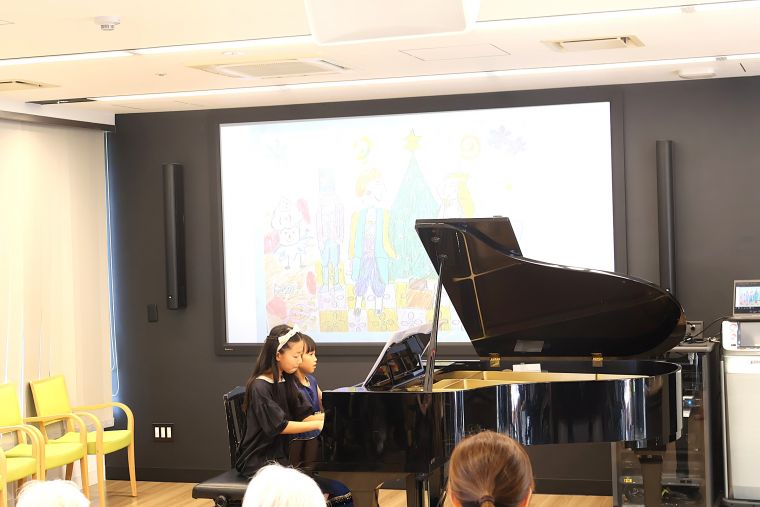 ヒルデモアたまプラーザ・ビレッジⅠの5階ホールにて近隣のピアノ教室である「えみ音楽教室」の生徒さんにご来館いただき、演奏会を開催しました。小さな生徒の皆さんによるピアノの演奏はもちろん、ハンドベルやパーカッションの合奏まで、賑やかな演目や季節にちなんだ曲が並びました。大型スクリーンには生徒さんが描かれた、演目を連想した絵も投影。耳だけでなく目でも、演奏をお楽しみいただけました。幼少期ピアノを習われていたご入居者は「小さいころを思い出しました」と振り返られたり、「若さをもらいました!」と終演後活き活きとされている方も。音楽の力と子供たちの元気に、満員の会場は大盛況でした。