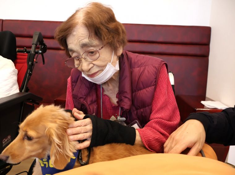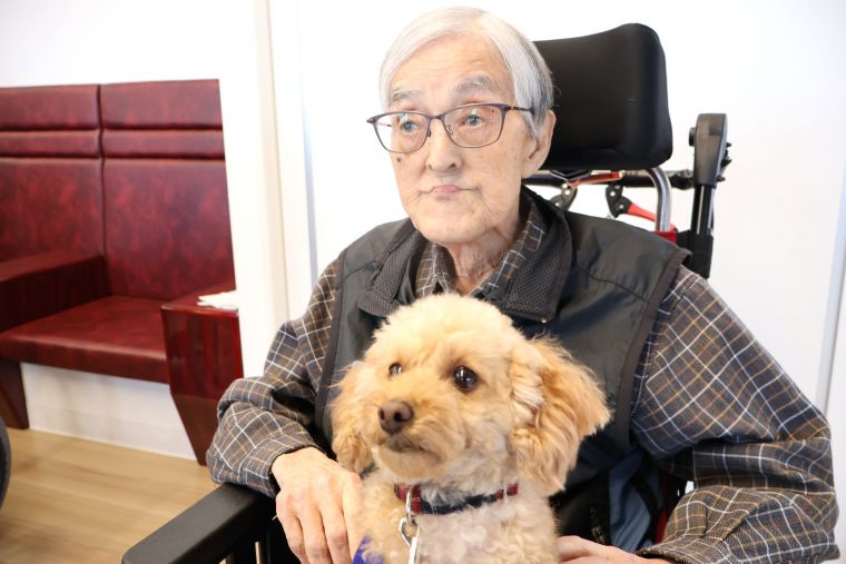先日、ヒルデモアたまプラーザ・ビレッジⅠの5階では恒例となっているドッグセラピーが開催され、今回も多くのご入居者にご参加いただきました。ふわふわの毛並みと優しい瞳を持つセラピー犬たちがホームに訪れると、皆さまの表情がぱっと明るくなり自然と笑顔がこぼれます。「昔飼っていた犬を思い出すわ」「本当に良い子ね~」と、懐かしい記憶を語りながら、優しく撫でる手には愛情があふれていました。セラピー犬とのふれあいは、ただ癒しをもたらすだけでなく、ご入居者同士の会話のきっかけにもなり笑い声が絶えない和やかな時間となりました。また、セラピー活動を支えてくださっているスタッフの皆様との交流も、毎回好評をいただいております。犬たちの性格や日々の様子などを聞くことで、より深い親しみを感じていただけるようです。