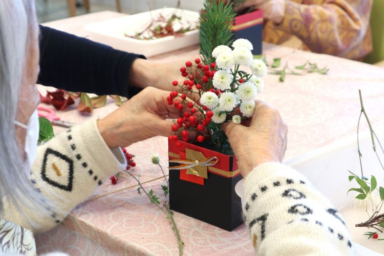 クリスマスが終わると、ヒルデモアたまプラーザ・ビレッジⅠでは慌ただしく年越しの準備ムードに包まれます。お正月に向けて、今回は講師の先生をお招きし、生け花の会を開催しました。華道のご経験がある方も多く、「これを中心にしようかしら」「ここはもう少し高さを出そうかな」と、皆様それぞれにこだわりを持って生けてくださいます。先生からのアドバイスに、「少し教えていただいただけで全然印象が変わるわね!」と感心される場面もありました。仕上がった華やかな作品は、お部屋の前やお気に入りの場所に飾られ、お正月を迎える準備は万端。新しい年が待ち遠しいですね!