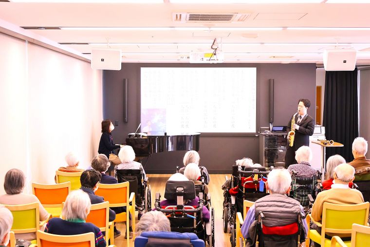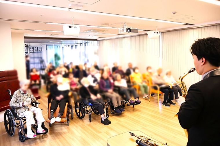ヒルデモアたまプラーザ・ビレッジⅠの5階ではサックス奏者をお招きし、心地よい音色に包まれるコンサートを開催しました。皆さまに馴染みのある唱歌や懐かしい流行歌が、サックスならではの豊かな響きで新鮮に感じられ「いい音色」「こんなに近くで生で聴いたのは初めて!」と大好評でした。歌詞カードを表示しての合唱コーナーでは、音楽療法士スタッフのピアノ伴奏とのコラボレーションもあり、会場は一体となって盛り上がりました。これからも、皆さまに楽しんでいただけるイベントを企画してまいります。