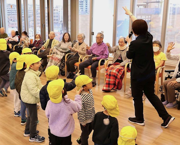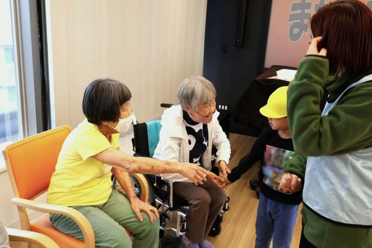 ヒルデモアたまプラーザ・ビレッジⅠの5階では、恒例の【美しが丘どろんこ保育園】との交流会を開催しました。じゃんけん大会や動物のまねっこ遊び、歌『虹』と手作りカレンダーの贈り物に笑顔が広がりました。最後はお菓子を手渡し、「きてくれてありがとう」「元気をもらったよ」「またきてね」と握手を交わし、温かな交流の時間となりました。