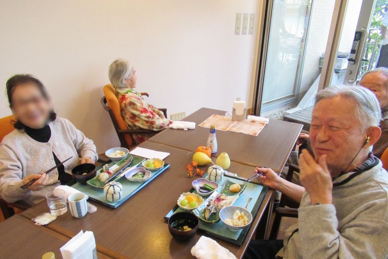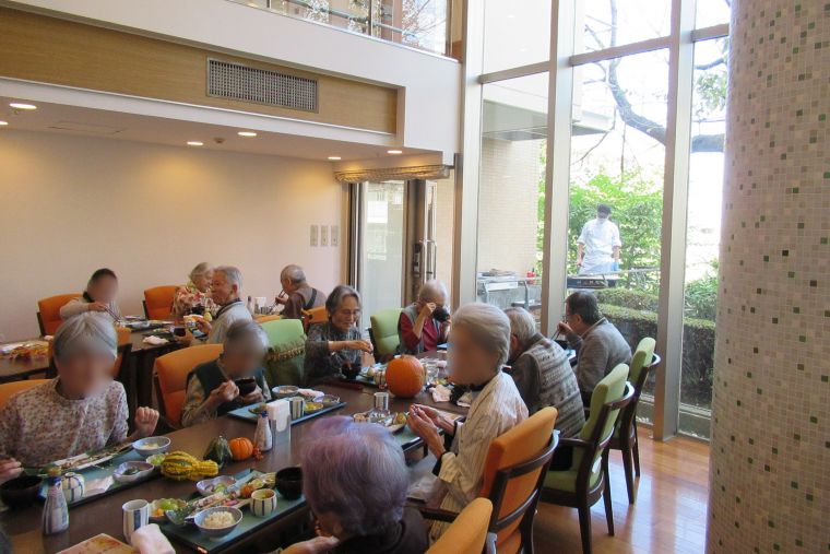 いよいよ秋本番です。暑かった夏も過ぎ去り、過ごしやすい季節がやってきました。暑い夏に食欲が低下してしまったヒルデモア・たまプラーザビレッジⅡのご入居者の「食欲の秋!美味しいものを食べたい!」という要望におこたえし、秋刀魚ご膳をご用意いたしました。ご入居者の目の前で炭火焼で焼かれた秋刀魚。栗ご飯、旬を詰め込んだ茶碗蒸し、デザートは柿と葡萄。秋の味覚を存分に楽しみ、季節の恵みに感謝しました。