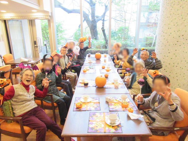 町中が大賑わいを見せる数少ないイベントの1つ。かぼちゃの置物やイルミネーションなどが彩り始めると一気にハロウィンムードが漂います。ヒルデモアたまプラーザ・ビレッジⅡでも大きなかぼちゃや置物などでハロウィンを迎えます。なかなか馴染みが少ないハロウィンですが、今年はパーティーを開催。由来や起源などはさておき甘~いデザートを準備しご入居者とワイワイ楽しみました。皆さん意外にも仮装はお好き!?なのでしょうか。準備した装飾をためらいなく身につけていらっしゃいました。笑顔があふれた1日でした。