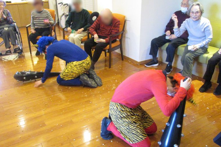 2月3日は節分です。ヒルデモアたまプラーザ・ビレッジⅡでも豆まきを行いました。赤と青の鬼が現れるとご入居者は準備していた福豆を鬼にめがけて「鬼は外」「鬼は外」と一斉に豆をまき邪気払いを行いました。鬼が弱ると今度は皆さん大きな声で「福は内」と大合唱!これには鬼も門前払い「参りました…」と早々退散していきました。ヒルデモアたまプラーザ・ビレッジⅡはご入居者のお陰で今年も笑顔が絶えない「福」がたくさんやってきそうです。