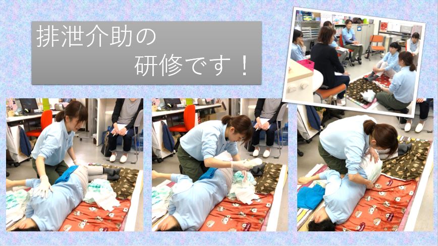 排泄介助の方法は、お客様の心身状況や環境に応じて、トイレ・ポータブルトイレでの排泄介助・おむつ交換などの方法がありますが、今回はおむつ交換に重点を置き研修を行いました!