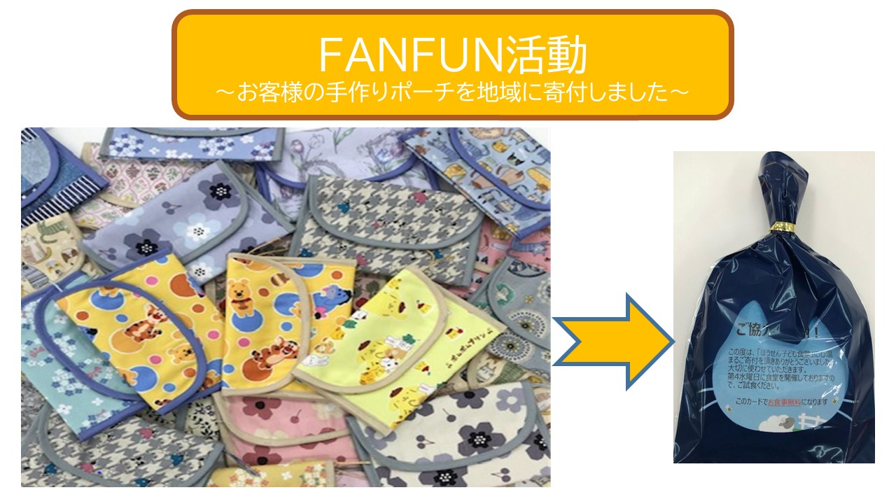 お客様の生きがいとされている手作り小物ポーチを地域へ寄付しました。