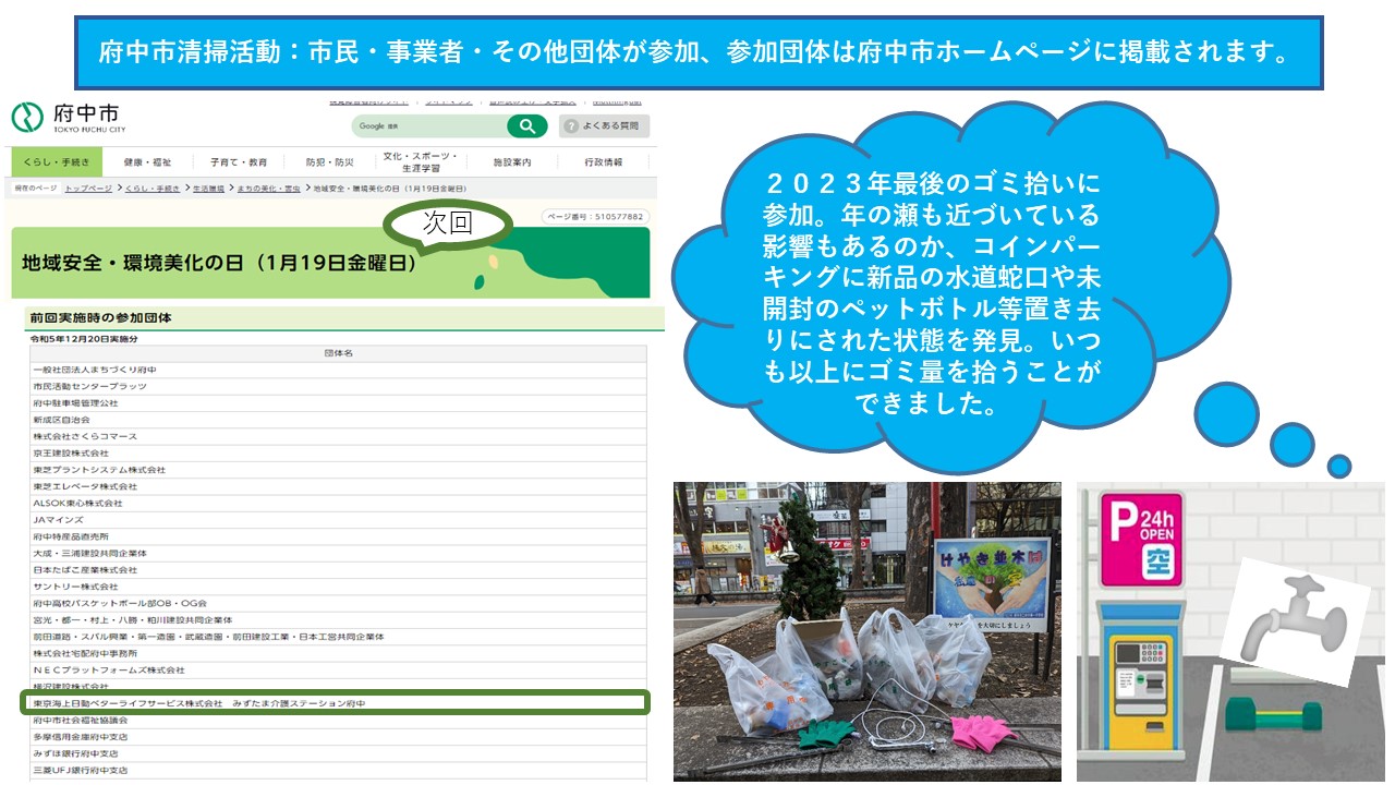 府中市の生活環境部・環境政策課が毎月開催している清掃活動に有志が集まり、朝の7:45から2023年最後のごみ拾い活動を行ってきました。今回は6回目の参加。年の瀬も迫っている影響もあるのか、未使用の水道蛇口やコードレスイヤホン、大きな板切れ等、いつもよりも多くゴミ量を拾うことができました。ゴミを拾いながら、このごみを放置することでマイクロプラスチックに変わり、環境汚染を招き、更に人間への健康被害を招く等、ゴミについて有志で話し合う時間を持つことができました。私たちは高齢者の介護を生業にしておりますが、『すべての人に健康と福祉』を満たすために、これからもゴミを拾いを通してSDGz活動を続けていきます。