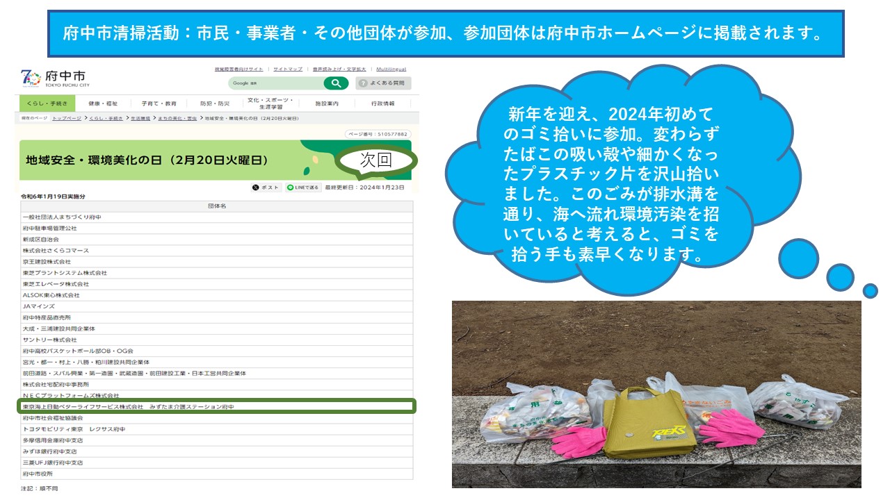 府中市の生活環境部・環境政策課が毎月開催している清掃活動に有志が集まり、朝の7:45から2024年始めてのごみ拾い活動を行ってきました。今回は7回目の参加。小さなプラスチック片を沢山拾い、このごみが排水溝を通り、海へ流れ環境汚染を招いていると考えると、ゴミを拾う手も素早くなります。
