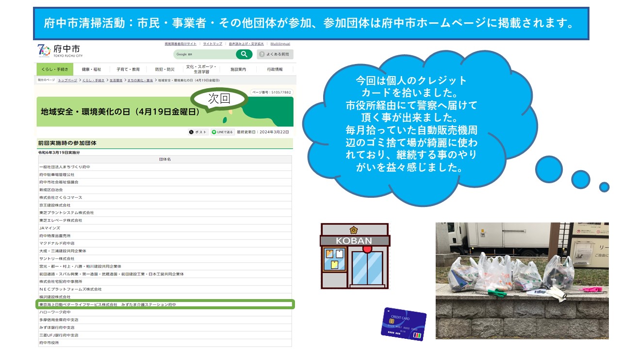 府中市の生活環境部・環境政策課が毎月開催している清掃活動に有志が集まり、朝の7:45からごみ拾い活動を行ってきました。今回は9回目の参加。毎回同じ道順で同じ場所を重点的に拾うので、なんと!あれだけゴミを入れられないほど溢れていた自動販売機周辺のゴミ捨て場が、綺麗に維持されていました。全員で感動し、やり続ける事の大切さを学びました。これからも私たちが援助させていただくお客様が安心して地域で暮らせるように、清掃活動を続けていきます。