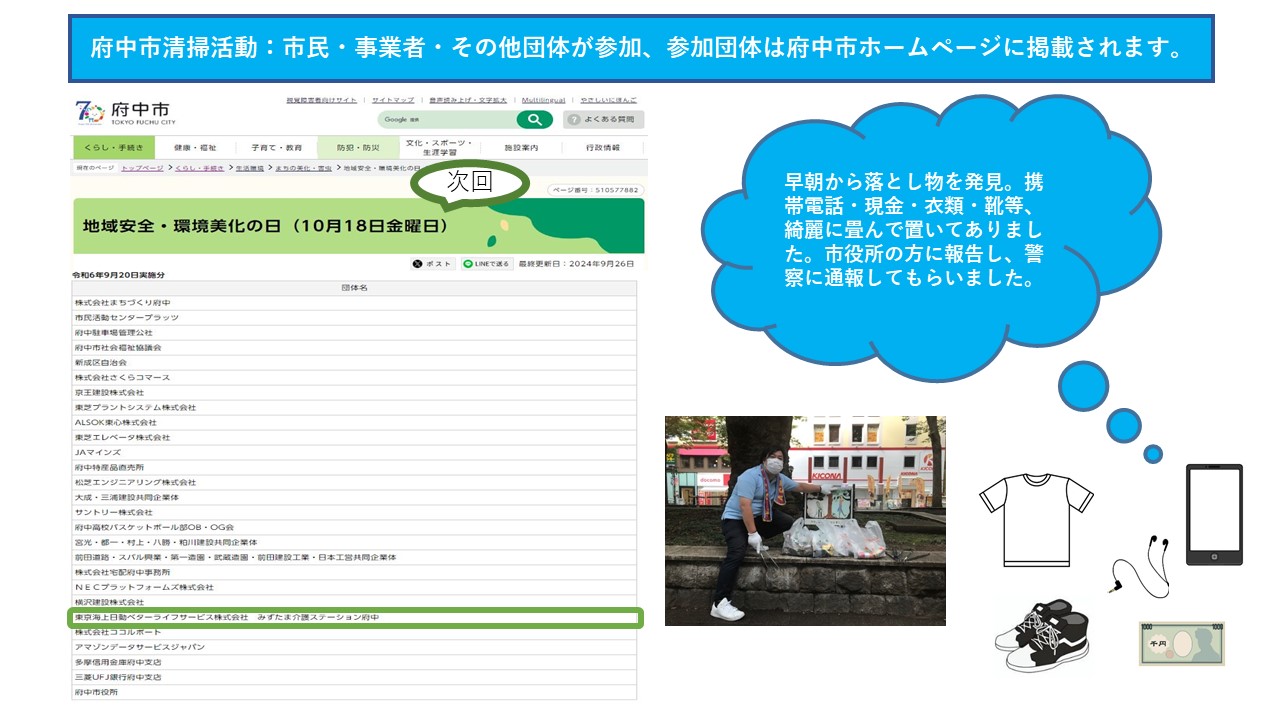 府中市の生活環境部・環境政策課が毎月開催している清掃活動に有志が集まり、朝の7:45からごみ拾い活動を行ってきました。今回は14回目の参加。毎回同じ道順で同じ場所を重点的に拾っています。植木に携帯電話・現金・衣類・靴等、綺麗に畳んで置いてありました。市役所の職員へ報告し、警察に通報してもらいました。持ち主の手元に届くこと願っています。