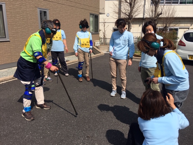 すべてを装着して屋外を歩くことで、いかに危険で不自由かを体験することができました。